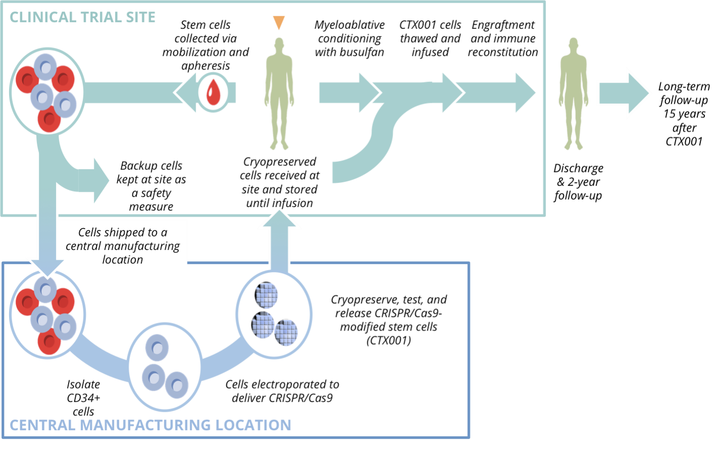 Before reinfusion, patients undergo myeloablative therapy with busulfan — a necessary reset that clears marrow space for the edited cells to engraft.