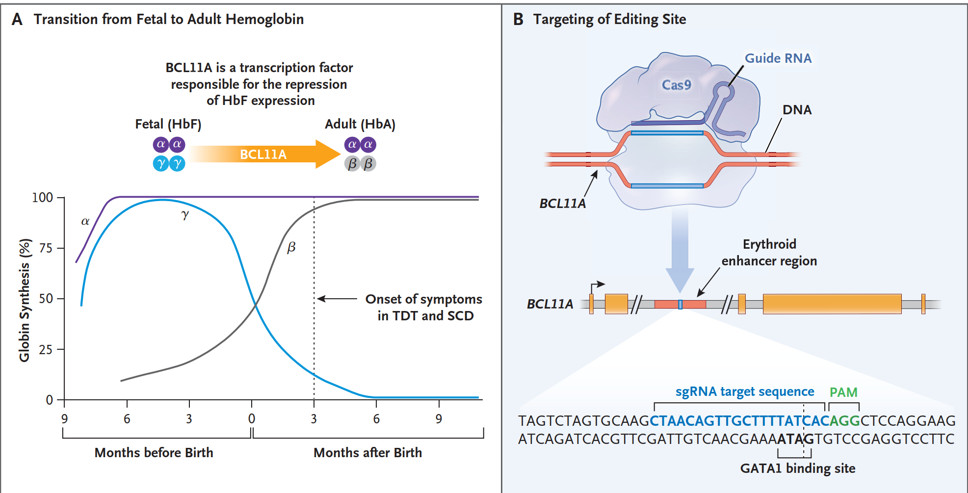 In sickle cell disease (SCD), the reactivated HbF prevents sickle hemoglobin (HbS) from polymerizing, halting the cascade of red-cell deformation and vaso-occlusion.6